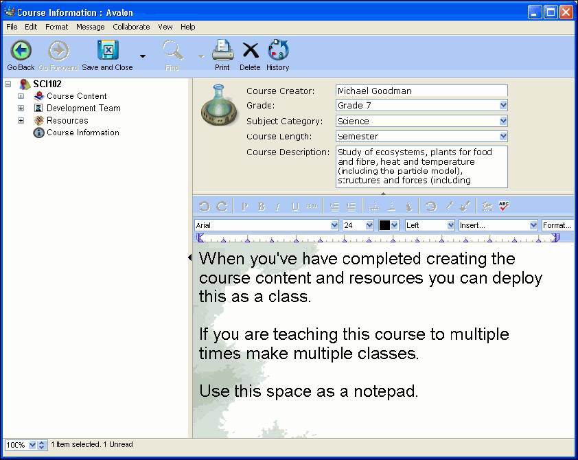 The lower pane can be used as a notepad to communicate with other course developers or make notes for yourself.